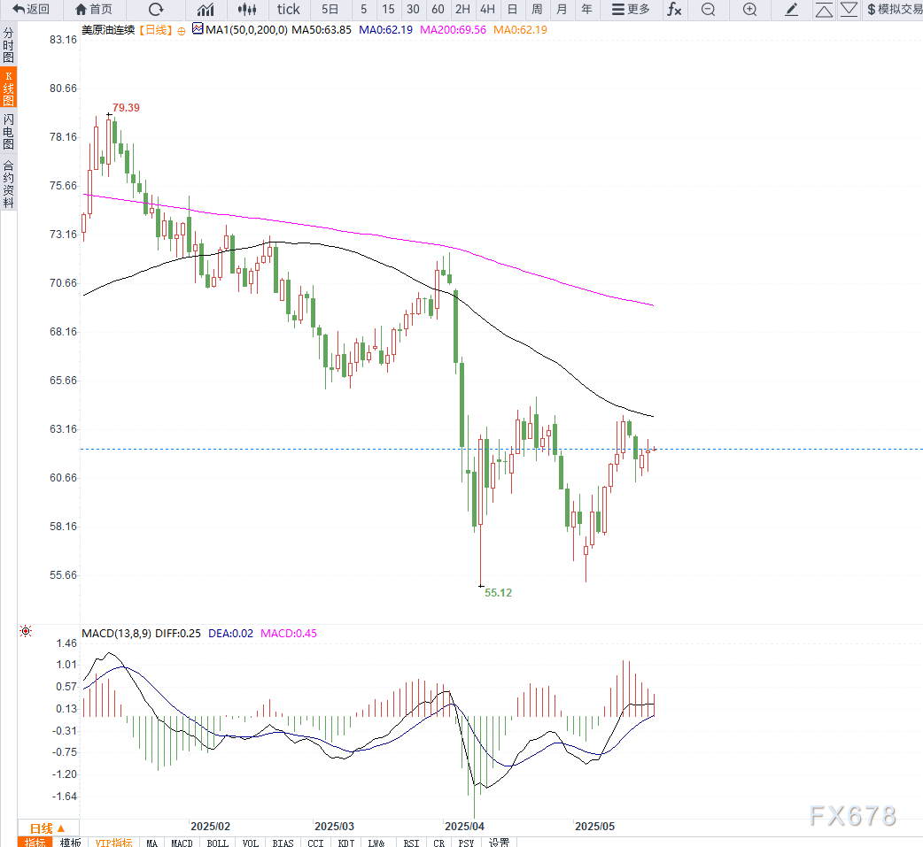 与此同时,穆迪调降美国主权信用评级至Aa1,引发市场对全球最大经济体健康状况的担忧。评级机构指出,美国债务负担及利息支出持续上升是此次评级调整的主因。   亚洲国家方面,最新数据显示,4月该国工业增加值与社会消费品零售总额双双放缓,令市场对全球原油需求前景更加谨慎。   Again Capital合伙人John Kilduff指出:“油市在可预见的未来仍将保持波动,投资者需持续关注美伊谈判走向、贸易政策变化以及俄乌冲突谈判进展。”   此外,美国财政部长贝森特强调,总统特朗普将对“不诚信谈判”的贸易伙伴实施先前承诺的关税,市场担忧由此引发的新一轮贸易担忧情绪可能进一步冲击需求预期。   从日线图来看,美国原油(WTI)当前维持短期震荡偏强格局。价格自4月中旬低点59.80一线反弹,连续站稳在60.50上方,短期20日均线呈现走平迹象,构成动态支撑,MACD指标金叉运行但动能柱缩窄,暗示多头动能趋于温和。   若油价突破63.30前高,有望测试65.00关键压力区域;反之,若跌破61.50支撑,则可能回调至60.20区域。
