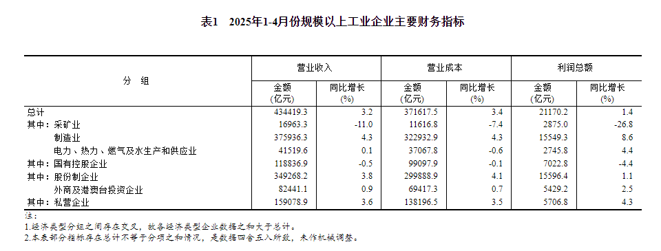 1—4月份,全国规模以上工业企业实现利润总额21170.2亿元,同比增长1.4%(按可比口径计算,详见附注二)。