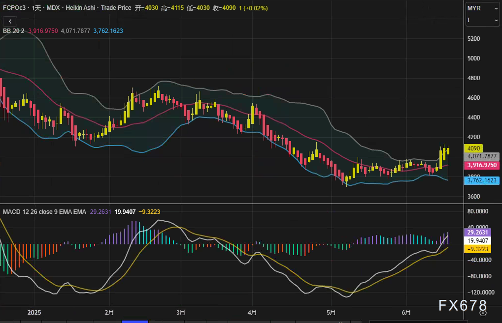 周三(6月18日),马来西亚衍生品交易所(BMD)毛棕榈油期货基准合约(FCPOc3)呈现窄幅震荡格局。主力2025年8月合约最新收报3840林吉特/吨(约合909.5美元/吨),较前一交易日微涨1林吉特,涨幅0.03%。日内波动区间在3823至4505林吉特/吨之间,布林带中轨4164林吉特成为多空争夺的关键位。市场在经历近期连续调整后,受到逢低买盘支撑,短期企稳迹象初现,但反弹动能受限,原油价格走弱及林吉特汇率走强对价格形成一定压制。