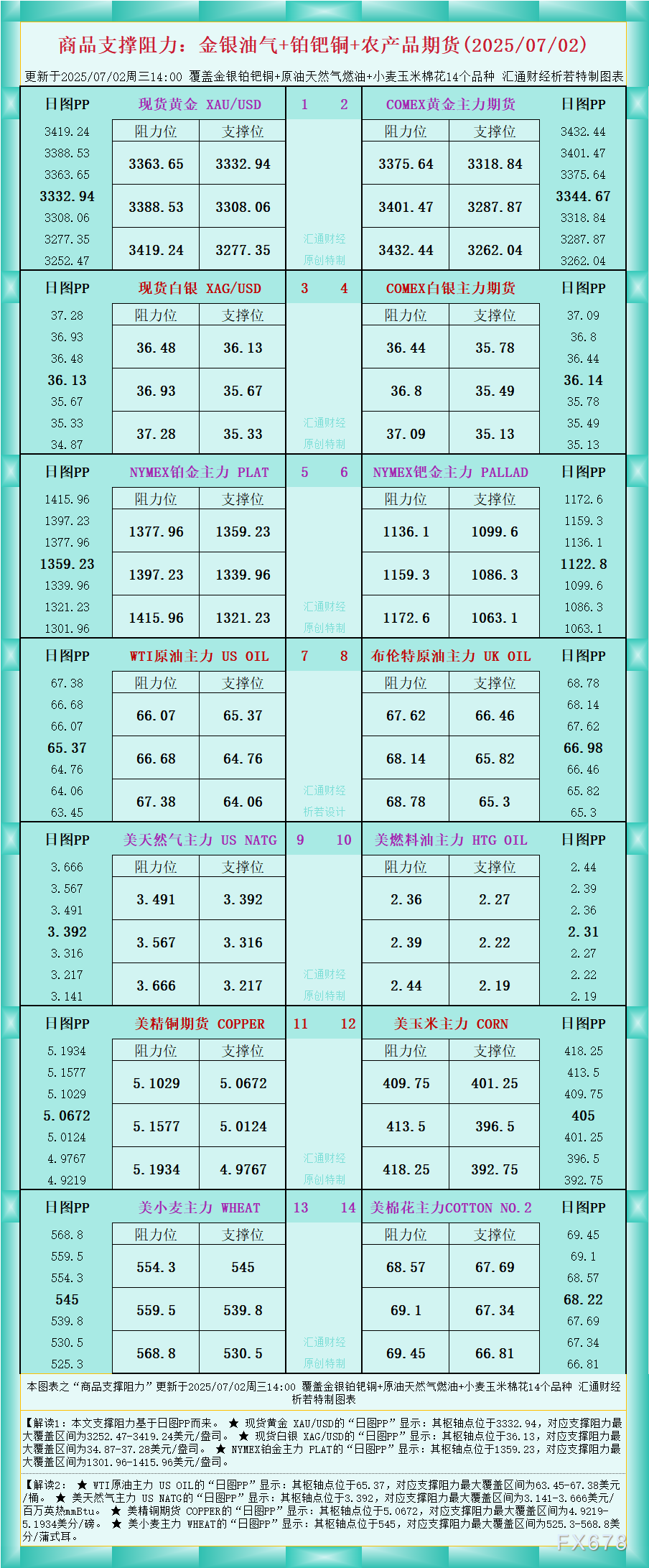 XM官网官网一张图看商品支撑阻力:金银油气+铂钯铜农产品期货(2025年7月4日